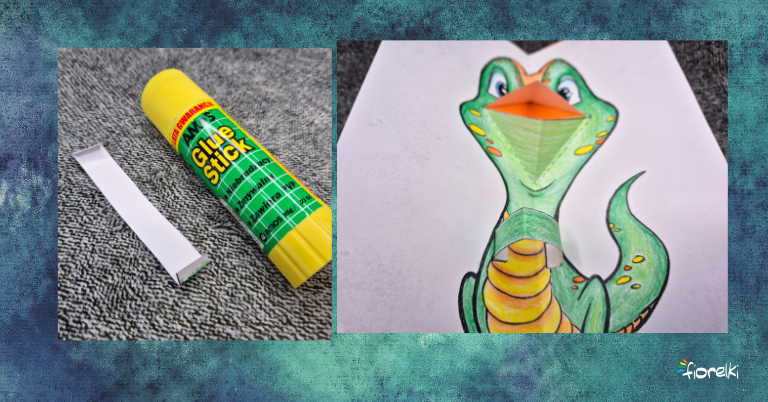 Weź kolorową kartkę A4 i zegnij ją wzdłuż na pół. Włóż pracę z dinozaurem do kolorowej kartki, posmaruj białą kartkę klejem i zamknij całość.