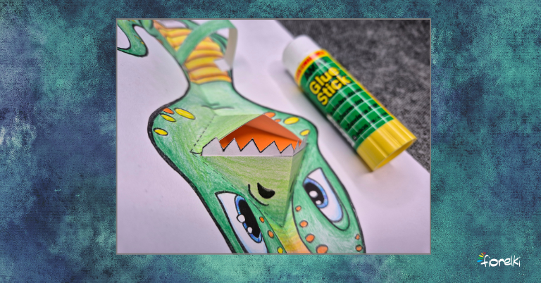 Ruchome prace plastyczne to świetna zabawa i ogromna radość dla dzieci. Tym razem stworzymy wyjątkową kartkę z dinozaurem, którego buzia otwiera się i zamyka podczas otwierania kartki, a do tego przygotujemy stożek z zapasem jedzenia dla naszego prehistorycznego bohatera. Zapraszam do wspólnego tworzenia.