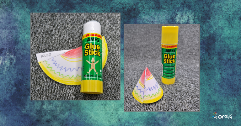Posmaruj klejem miejsce wyznaczone na półokręgu. Połącz oba końce półokręgu, tworząc stożek. Przyklej gotowy stożek do łapek dinozaura.