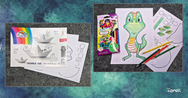 Na białej kartce A4 z bloku technicznego wydrukuj oba szablony – dinozaura oraz dodatki. Następnie pokoloruj dinozaura oraz wszystkie elementy dodatkowe. Kontury możesz delikatnie podkreślić zakreślaczem.
