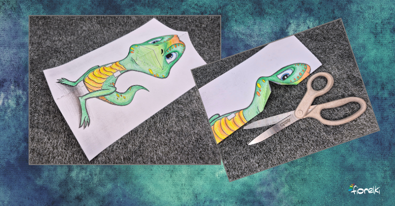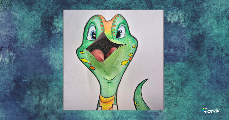 Po połączeniu obu stron kartki, podczas jej otwierania buzia dinozaura powinna się zamykać.