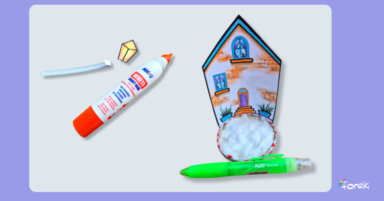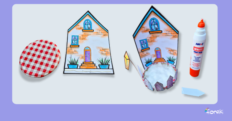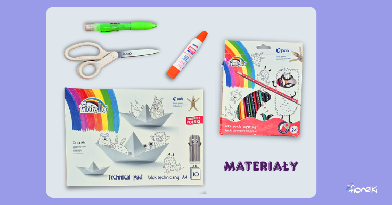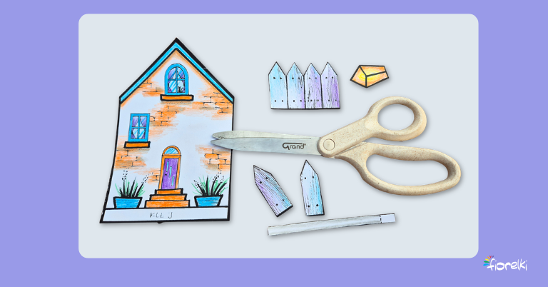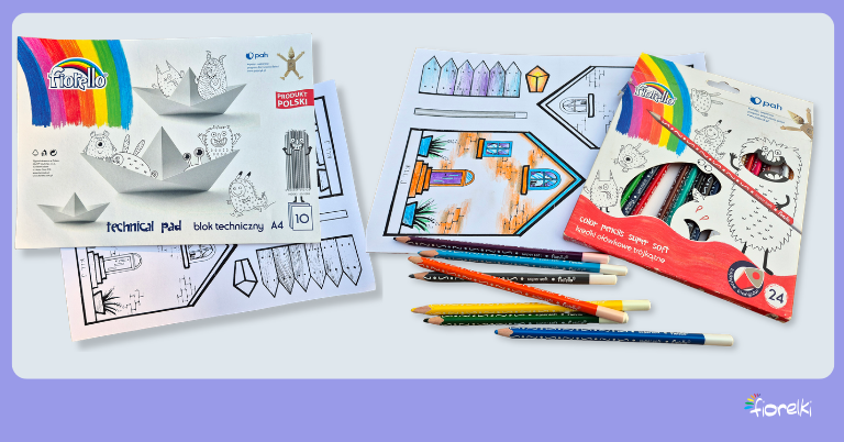 Na białej kartce technicznej A4 wydrukuj szablon domku. To będzie sztywna baza, na której dzieci będą kolorować i wycinać wszystkie elementy. Przy użyciu kredek Fiorello pokoloruj domek, płotek i latarnię. Zachęć dzieci do kreatywnego wykorzystania kolorów – mogą dodać kwiaty, okiennice lub inne ozdoby.