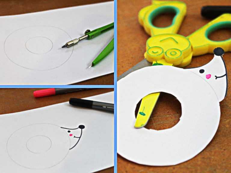 Na sztywnym kawałku papieru rysujemy cyrklem pierścień, czyli dwa okręgi różnej wielkości ze wspólnym środkiem. Do tego dorysowujemy buzię jeża, tak jak na zdjęciu. Następnie wycinamy całość, włącznie w otworem w środku jeża.