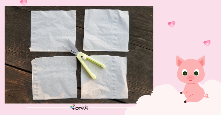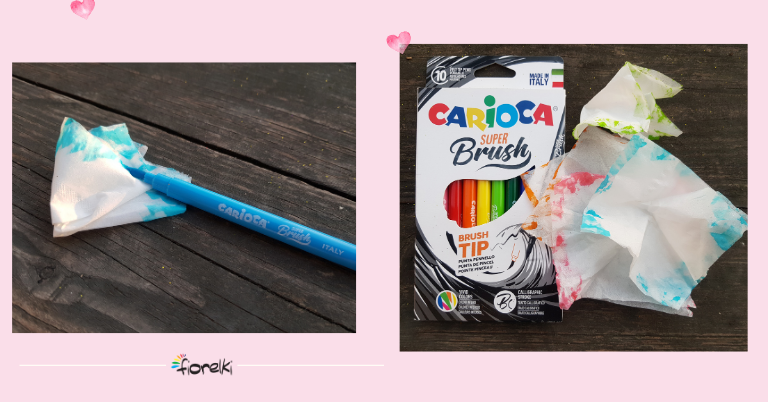 Chusteczkę higieniczną przecinamy na 4 części. Ściskamy ją na środku, tworząc kwiatek, a brzegi kolorujemy pisakami.