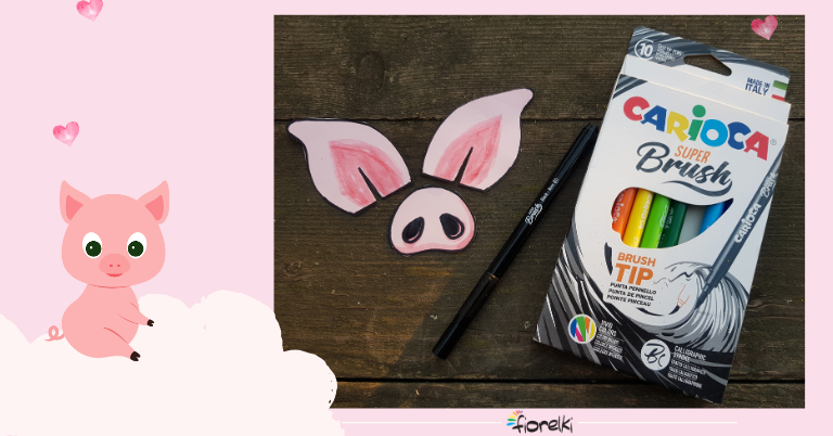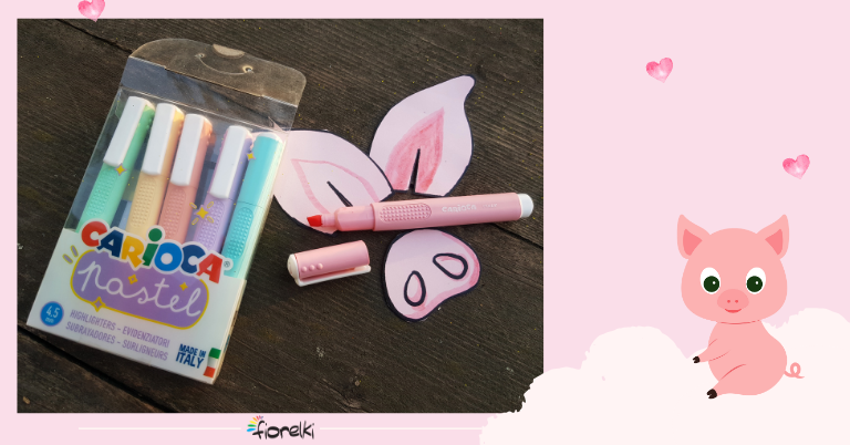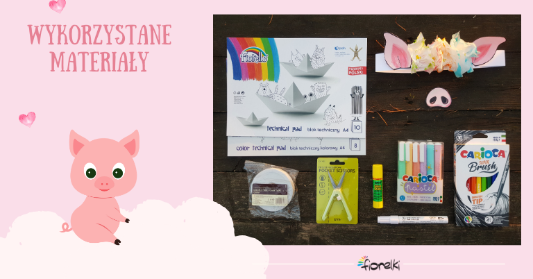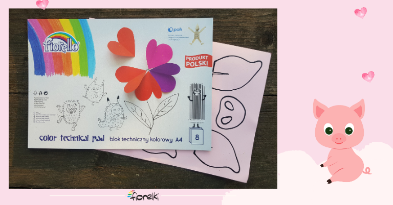 Na różowej kartce z bloku technicznego A4 drukujemy szablony ryjków i uszek, które będą podstawą naszego przebrania.