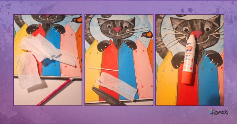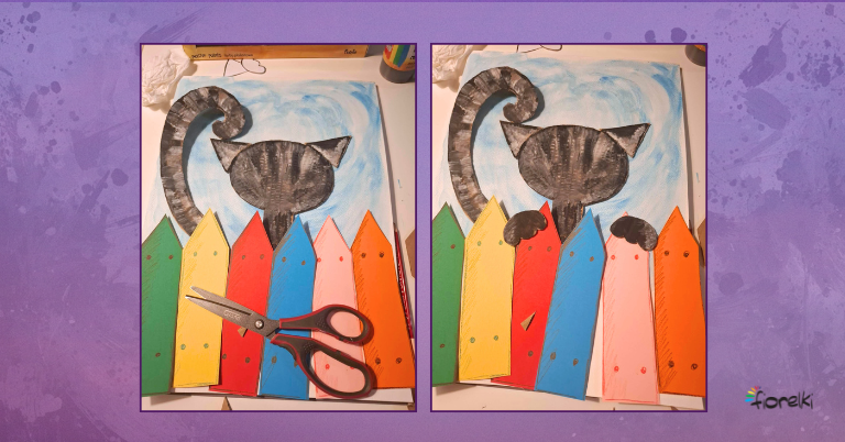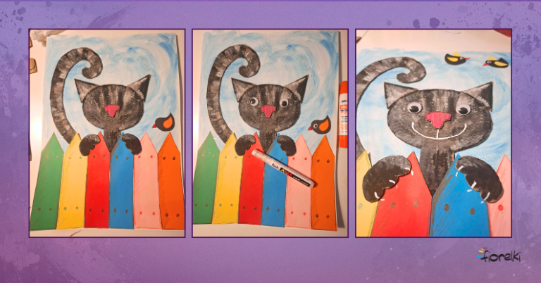 Po wyschnięciu farb wytnij wszystkie tekturowe części kotka. Na przygotowanym tle ułóż kompozycję: w dolnej części kartki ustaw kolorowe sztachetki obok siebie, nad nimi umieść głowę kotka, jego ogon, a przy środkowych sztachetkach – łapki.