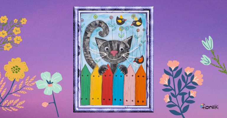 Bohaterem dzisiejszej pracy jest kotek ukrywający się za kolorowym płotkiem. Wychyla ciekawską głowę, opiera łapki o sztachetki, pręży swój długi, puszysty ogon i z zainteresowaniem obserwuje świat. Towarzyszą mu rozśpiewane ptaszki, które dodają całej scenie radosnego charakteru.