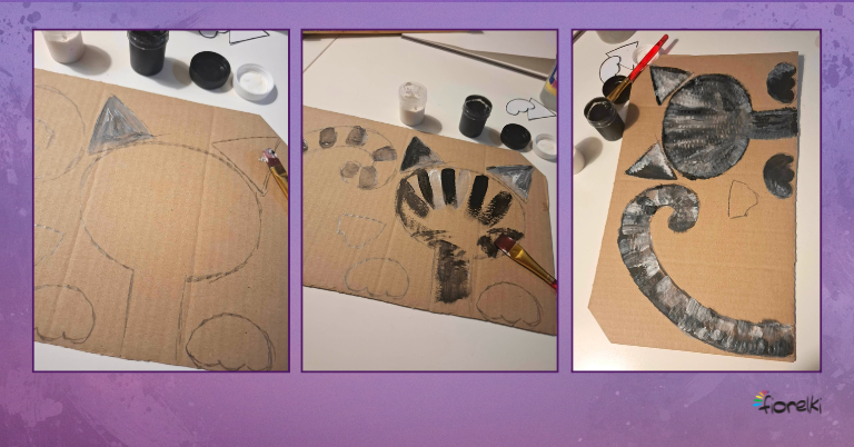 Odrysowane elementy pomaluj farbami plakatowymi. Samodzielnie zdecyduj, jaki kolor będzie miało futerko kotka – może być czarny, rudy, szary, w paski lub łatki. Kotek może wyglądać tak, jak podpowie Ci wyobraźnia. Pozostaw pomalowane elementy do wyschnięcia.