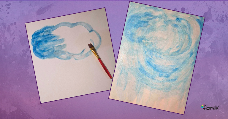 Kartkę z bloku artystycznego art deco A3 pomaluj rozwodnioną niebieską farbą plakatową – powstanie delikatne, lekkie tło przypominające niebo. Odłóż kartkę do całkowitego wyschnięcia.