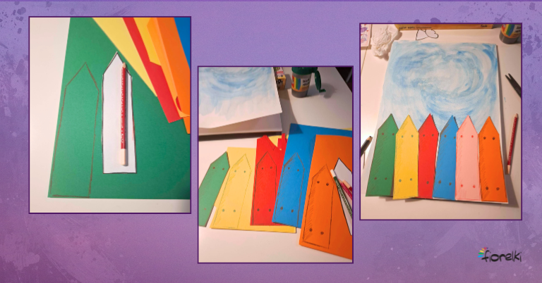 Na kartkach z kolorowego bloku technicznego odrysuj sześć sztachetek. Każda może być w innym kolorze. Delikatnie je pocieniuj, a u góry i u dołu dorysuj małe kółeczka imitujące gwoździe. Wytnij elementy płotu nożyczkami.