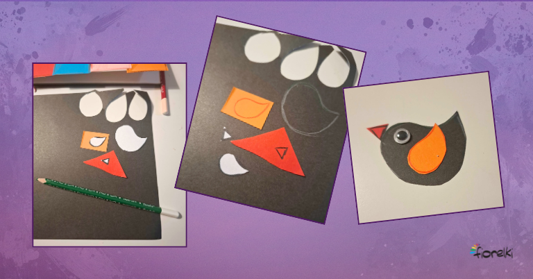 Na czarnej kartce z bloku technicznego odrysuj kilka ptaszków. Na czerwonej kartce przygotuj dzióbki, a na kartkach w wybranych kolorach – skrzydełka. Wytnij wszystkie elementy i rozmieść ptaszki na płotku oraz na niebie w górnej części pracy.