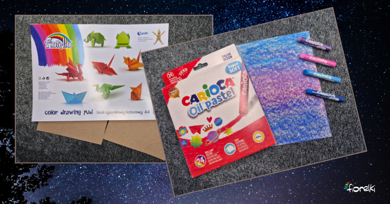 Weź tekturę z tyłu bloku A4 i przetnij ją na pół. Sięgnij po pastele olejne i pokryj całą powierzchnię kolorami, które kojarzą Ci się z nocą, snem albo kosmosem. Nie koloruj dokładnie – zostaw prześwity, puste miejsca i nierówności. To bardzo ważne, bo właśnie tam za chwilę „złapie się” tusz.