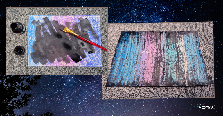 Teraz szybko pokryj całą tekturę czarnym tuszem. Nie poprawiaj, nie wygładzaj – działaj spontanicznie. Zanim tusz zdąży całkiem wyschnąć, włóż pracę pod bieżącą wodę i delikatnie go zmyj; zobaczysz, jak spod czerni zaczynają wychodzić kolory pasteli. Odłóż tekturkę do wyschnięcia i pozwól, by tło spokojnie „dojrzało”.
