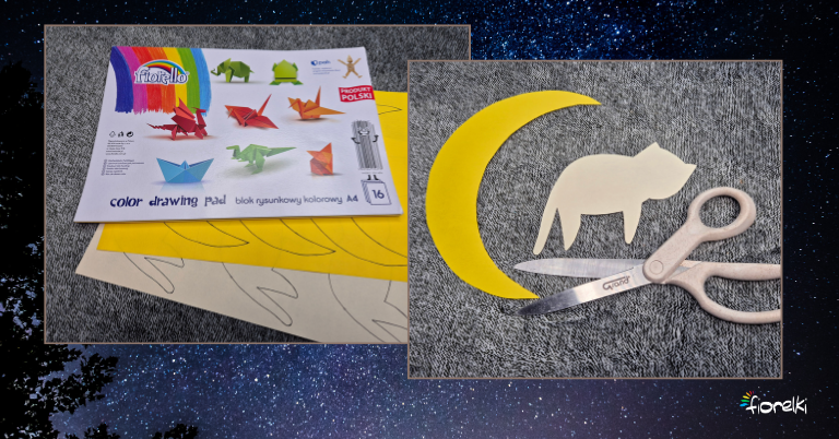 Na żółtej kartce wydrukuj lub narysuj kształt księżyca. Na kartce w wybranym kolorze narysuj kota – może siedzieć, może się przeciągać, może mieć zawinięty ogon. Wytnij jednego kota i jeden księżyc. Dorysuj kotu pyszczek, zamknięte oczka i wąsiki. Jeśli chcesz, dodaj prążki albo inne drobne detale.