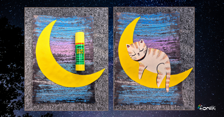 Gdy tło jest już całkowicie suche, przyklej żółty księżyc. Następnie ułóż na nim kota i przyklej go tak, jakby wygodnie siedział i obserwował nocne niebo. Kompozycja zaczyna żyć – to moment, w którym praca naprawdę nabiera charakteru.