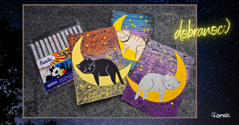 Tworzenie prac plastycznych z wykorzystaniem nietypowych technik to doskonały sposób na rozwijanie wyobraźni i ekspresji artystycznej u dzieci. Tym razem proponujemy wyjątkową zabawę, w której główną rolę odgrywa kontrast kolorów, tusz oraz pastelowe prześwity. Efektem końcowym jest nastrojowa ilustracja przedstawiająca kota wylegującego się na księżycu, otoczonego gwiazdami. To praca, która łączy eksperymentowanie z materiałami plastycznymi i spokojne, twórcze wycinanie oraz komponowanie elementów.