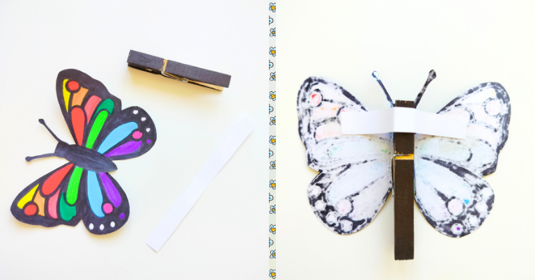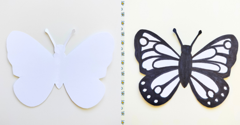 Na białym papierze technicznym naszkicuj kształt motyla i dokładnie go wytnij. Pokoloruj skrzydełka według własnego pomysłu, używając pisaków i czarnego markera.