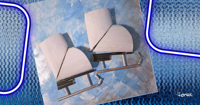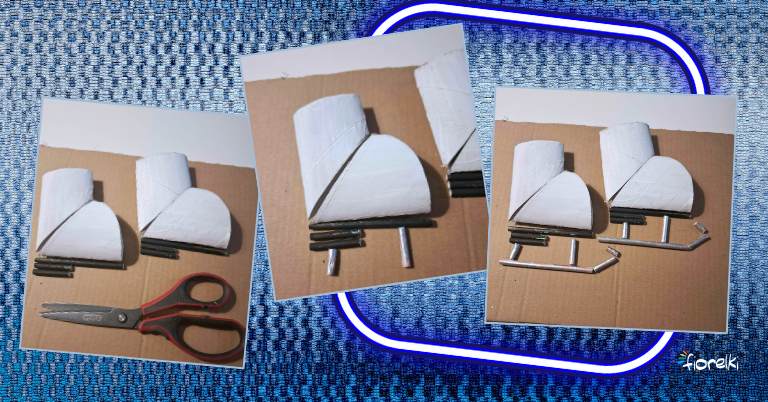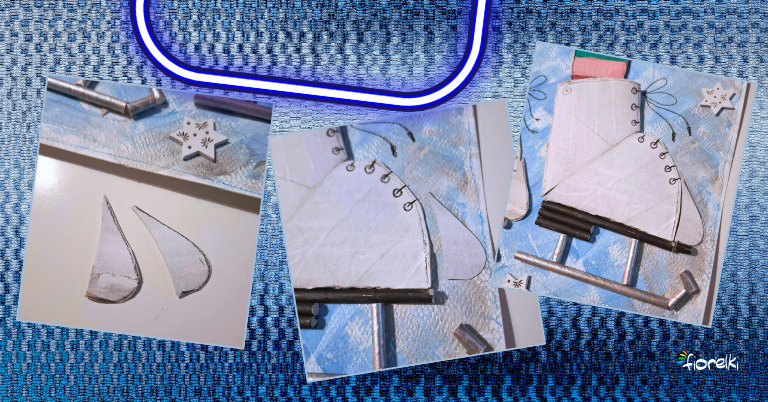 Z wyciętych elementów ułóż dwa buciki – łyżwy. Z czarnych rurek przygotuj podeszwy, przycinając je na długość butów, oraz obcasiki z krótkich fragmentów (na jeden obcasik wykorzystaj dwa kawałki o długości około 2 cm). Z rurek pomalowanych na srebrno ułóż metalowe płozy. Przy każdym buciku umieść dwie krótkie pionowe rurki )jedną przy obcasie, drugą z przodu podeszwy), jedną długą ułożoną poziomo oraz dwa króciutkie elementy zaokrąglające przód płozy.
