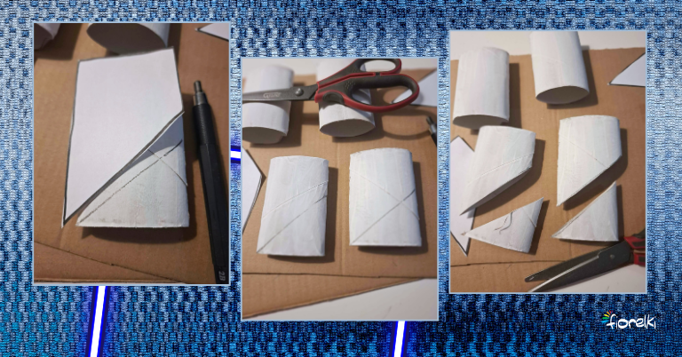 Wytnij przygotowane wcześniej szablony. Pomalowane na biało tekturowe rolki delikatnie spłaszcz i na każdej z nich odrysuj ołówkiem elementy butów – dwa razy jedną część i dwa razy drugą. Następnie wytnij wszystkie elementy po śladzie ołówka. Odciętych fragmentów rolek nie wyrzucaj – przydadzą się później.