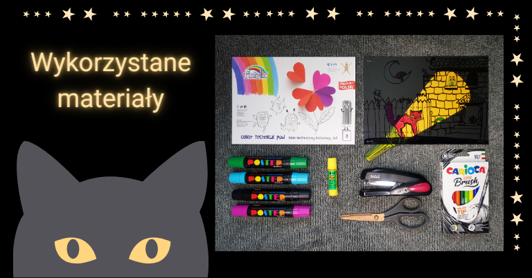 Przygotuj się do kolorowania swojej ilustracji, używając markerów Poster Fiorello. Dzięki nim praca zyska wspaniały charakter i będzie trwała, ponieważ każdy z pisaków jest permanentny. Pamiętaj, aby unikać bieli i żółci, pozostawiając miejsce dla tajemnicy nocnych kotów. Następnie zszyj w czterech rogach czarną kartkę z bloku technicznego A4 z folią, na której znajduje się Twoja nocna ilustracja.