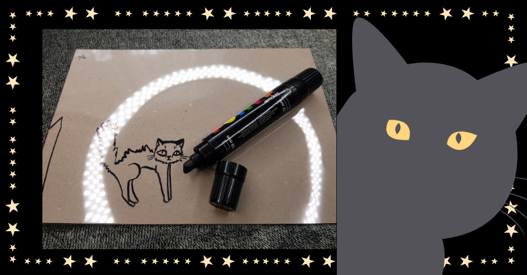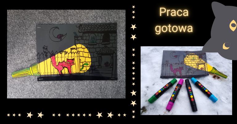 Wsuń światło latarki pomiędzy folię a czarną kartkę. Teraz możesz poszukać ukrytych na ilustracji detali, takich jak pozostałe kotki, księżyc, domek i wszystko to, co przyszło Ci na myśl podczas tworzenia tej pracy.