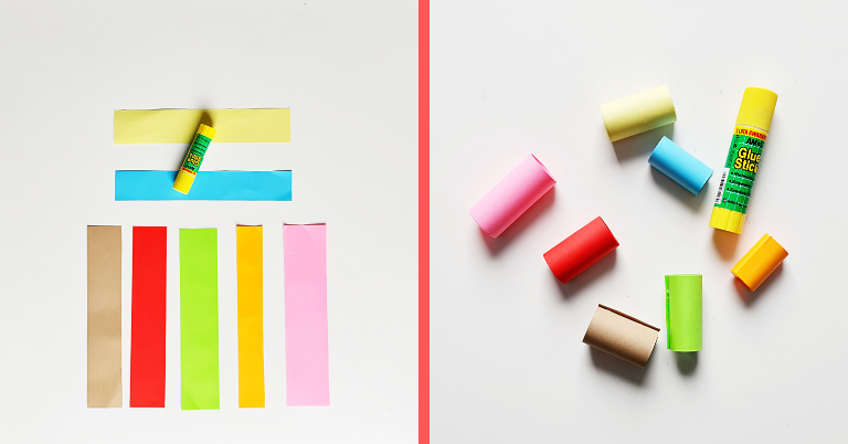 Wybieramy siedem kolorów kartek, z każdego koloru wycinamy jeden pasek.Potrzebujemy: