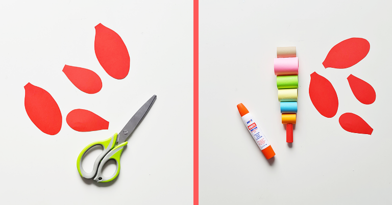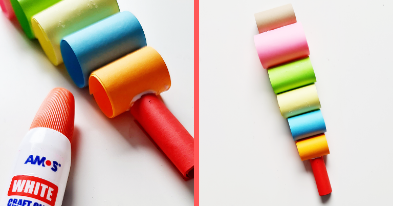 – po jednym pasku o szerokości: 5 cm, 4,5 cm, 3,5 cm, 3 cmKażdy z pasków zwijamy w rulon. Przed przyklejeniem do siebie regulujemy ich średnicę, tak aby niektóre były szersze.