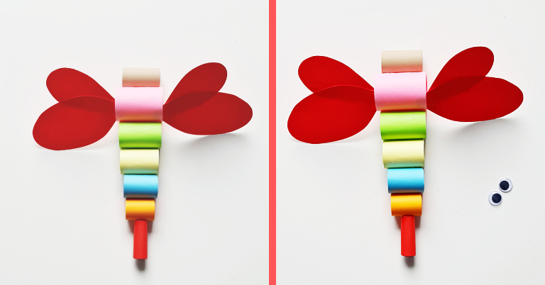 Kolejnym etapem do zrobienia są skrzydła; robimy je w kolorze takim jak ostatni rulon. Na czerwonej kartce rysujemy skrzydła, następnie je wycinamy i ponownie odrysowujemy, aby były tej samej wielkości po obu stronach. Przyklejamy je pod drugim, najszerszym rulonem. Na koniec doklejamy ruchome oczka do pierwszego rulonika.