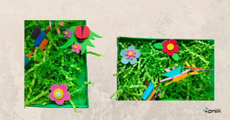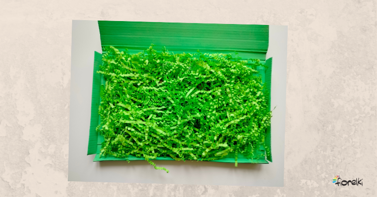 Środek pudełka wyklej paskami zielonej bibuły – dzięki temu uzyskasz efekt przestrzennej trawy.