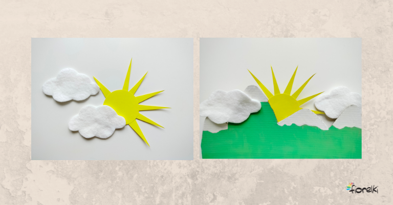 Z żółtego papieru wytnij słońce, a z wacików zrób chmurki. Przyklej je w górnej części pracy.