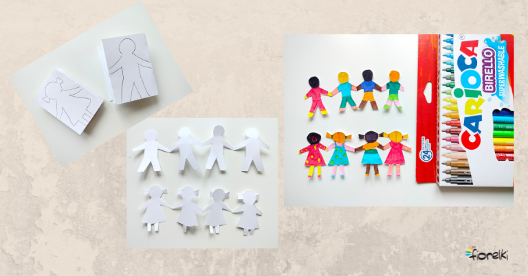 Złóż białą kartkę na cztery części, narysuj sylwetki chłopca i dziewczynki. Wytnij i rozłóż – dzieci będą trzymać się za ręce. Pokoloruj postacie pisakami Carioca – im bardziej kolorowo, tym lepiej!