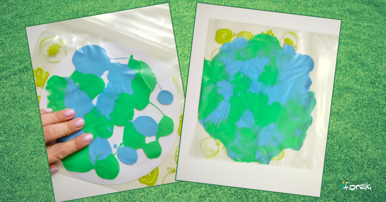 Wytnij z białej kartki kształt Ziemi (koło), a następnie nałóż punktowo farby: zieloną (ląd) i niebieską (oceany). Włóż kartkę do torebki strunowej i dokładnie ją zamknij. Zadaniem dziecka jest rozsmarowanie farby paluszkami po całej powierzchni – bez kontaktu z farbą! Po zakończeniu wyjmij pracę z torebki i odstaw do wyschnięcia.