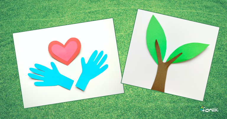Z kolorowego papieru wytnij dwa serca oraz kształt młodej roślinki, następnie na niebieskim papierze odrysuj dłonie dziecka i ostrożnie je wytnij.