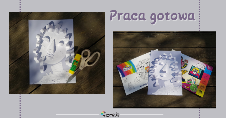 Doklejamy usta, policzki, źrenice, co tylko chcemy… cały czas wykorzystując ścinki z tej samej kartki białego papieru.
