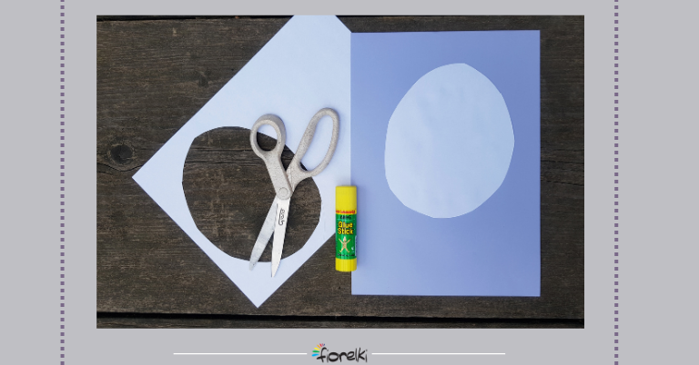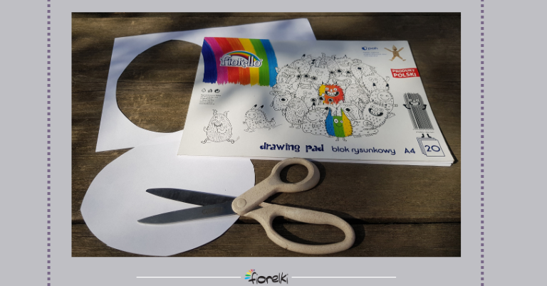 Z białej kartki z bloku rysunkowego A4 wycinamy owal, mniej więcej wielkości połowy kartki.