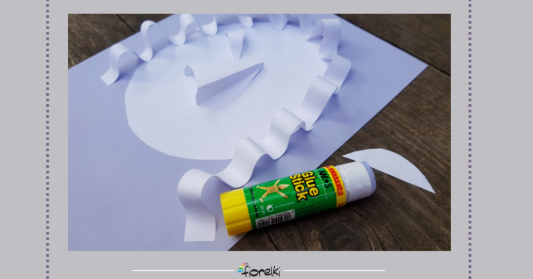 Tworzymy górne powieki oczu na bazie kształtu „pół listka”. Pamiętajmy, że jeśli chcemy, aby element był widoczny, nie możemy go przykleić na całej powierzchni (na płasko) – jego elementy muszą odstawać choćby lekko od kartki.