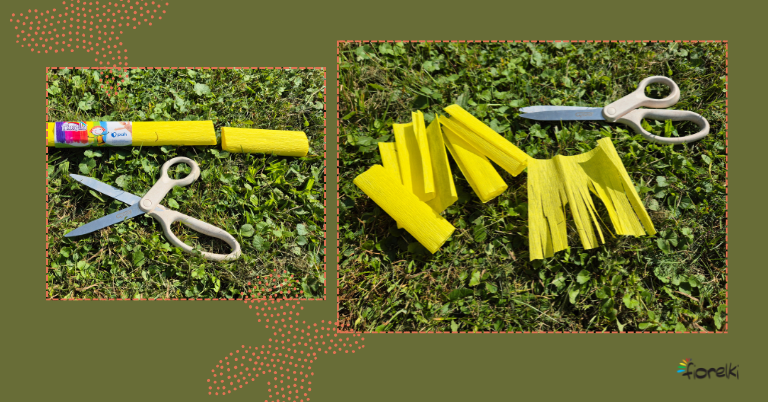 Żółta bibuła posłuży do zrobienia charakterystycznych „słomianych” elementów. Odcinamy kawałek o szerokości około 10 cm, dzielimy go na mniejsze kwadraty, a następnie nacinamy, tworząc efekt słomy.