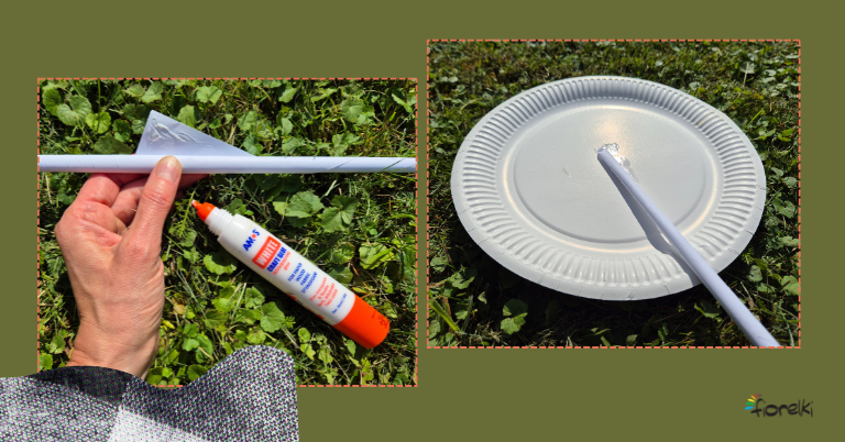 Pierwszym krokiem jest przygotowanie buzi stracha. Z papierowych ścinków wycinamy dwa różowe kółka – będą to policzki – oraz dwa mniejsze czarne koła na oczy i pomarańczowy trójkącik jako nos. Przyklejamy je na spód papierowego talerzyka, tworząc wesołą twarz.