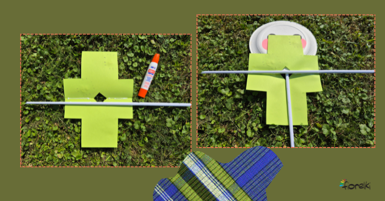 Powstałe patyczki będą pełniły rolę ramion i nóg. Jeden z nich przyklejamy z tyłu głowy, pamiętając o odpowiednim ustawieniu, aby strach nie był „do góry nogami”.