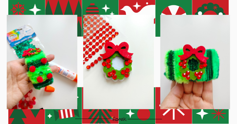 Następnie przechodzimy do etapu ozdabiania. Skorzystamy z filcowego wianka z zestawu ozdób Fiorello, a żeby nieco go ożywić, przyklejamy do niego czerwone diamenciki Fiorello. Teraz klejem uniwersalnym Amos doklejamy wieniec do bransoletki, dodając w ten sposób delikatny, świąteczny akcent. Możemy pójść jeszcze krok dalej i dodać na całym obwodzie bransolety czerwone pomponiki oraz zielone cekiny. Przyklejamy je również klejem w płynie Amos.