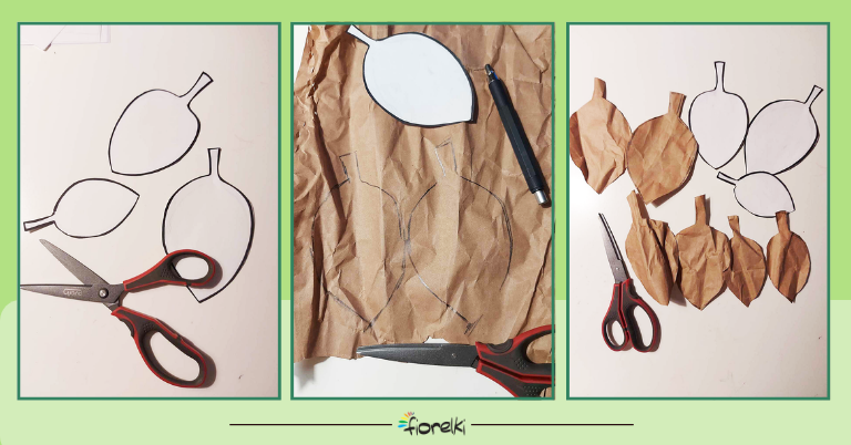 Rozpocznij od przygotowania wszystkich niezbędnych materiałów. Potrzebujesz szablonów liści, szarego papieru, ołówka, nożyczek, chusteczek higienicznych, farb plakatowych, pędzelka, kubka niekapka, zszywacza, zszywek, kredek, ruchomych oczek i zielonych małych pomponików. Trzy szablony liści trzeba odrysować na szarym papierze i wyciąć.
