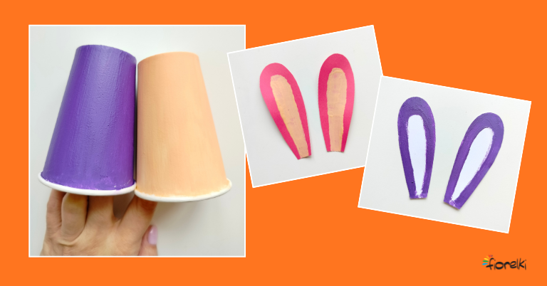 Na początku malujemy papierowe kubeczki – jeden na kolor fioletowy, drugi na kremowy, odkładamy je do wyschnięcia. Z kolorowego papieru wycinamy uszy zajączków. Możemy je dodatkowo ozdobić lub pomalować farbami, aby były jeszcze bardziej kolorowe i wiosenne.