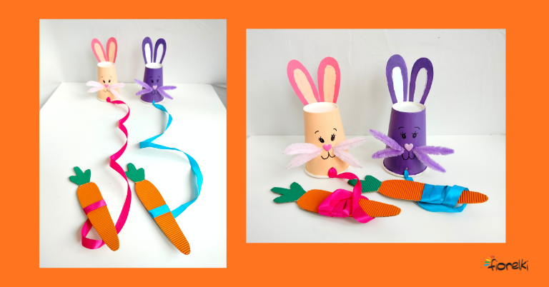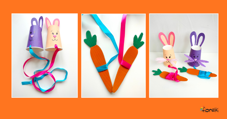 Zajączki ustawiamy daleko od siebie i rozwijamy wstążki na całą długość. Zadaniem dziecka jest szybkie zwijanie wstążki wokół marchewki i przyciągnięcie zajączka do siebie. Kto zrobi to pierwszy – wygrywa! To nie tylko wielkanocna praca plastyczna, ale również angażująca zabawa ruchowa, która wspiera rozwój dziecka i dostarcza mnóstwo śmiechu.