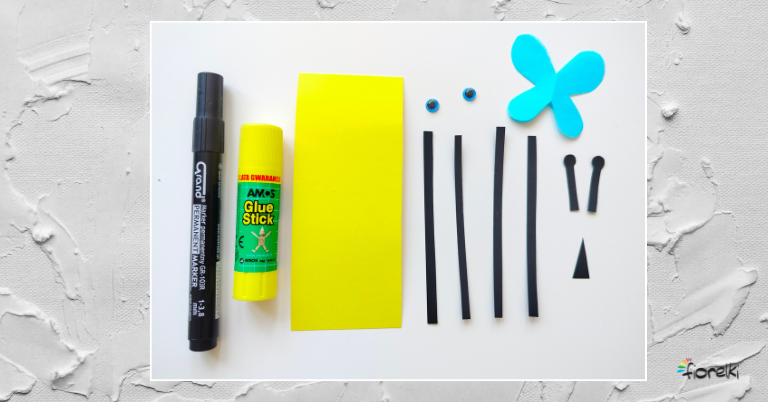 Odetnij kawałek rolki po papierze. Wytnij prostokąt z żółtego papieru, dopasuj do rolki i przyklej. Z czarnego papieru wytnij paski, czułki i żądło. Przyklej je, dodaj oczka i narysuj uśmiechniętą buzię markerem. Z niebieskiej bibuły wytnij skrzydełka i przyklej do rolki.